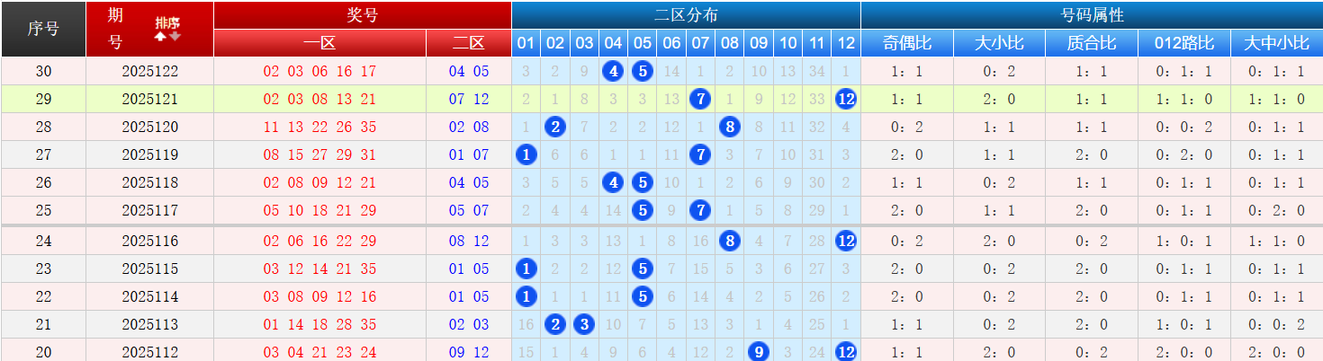 小号区间控场:后区01-06区间号码近10期占比70%,尤其是01、05、12成高频号,本期04、05继续强化此趋势。