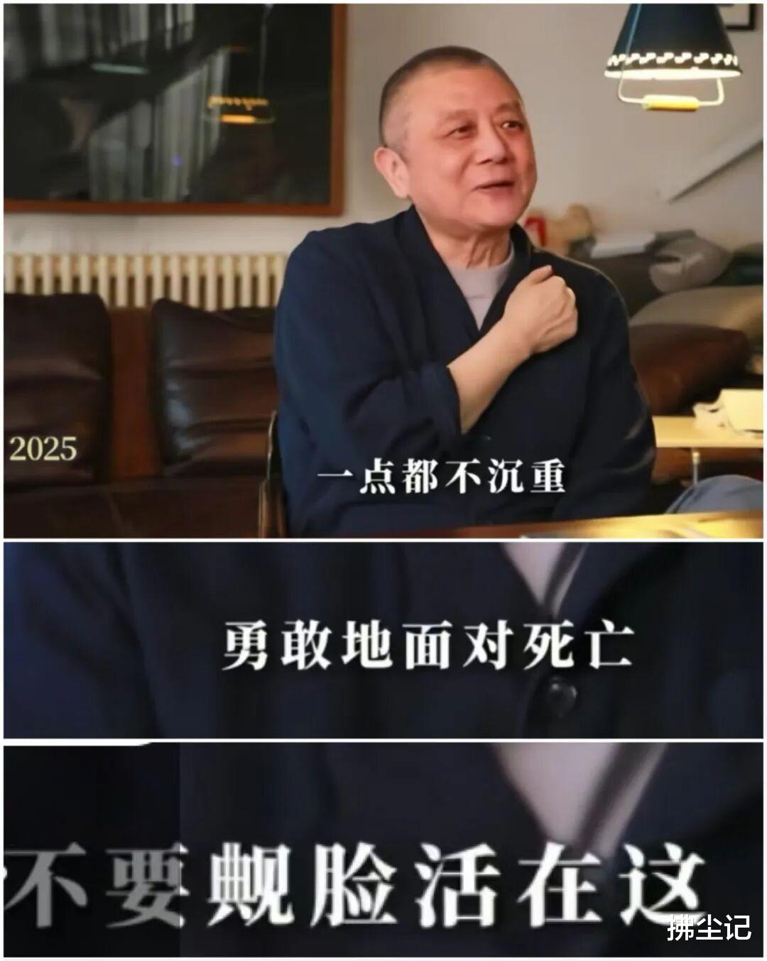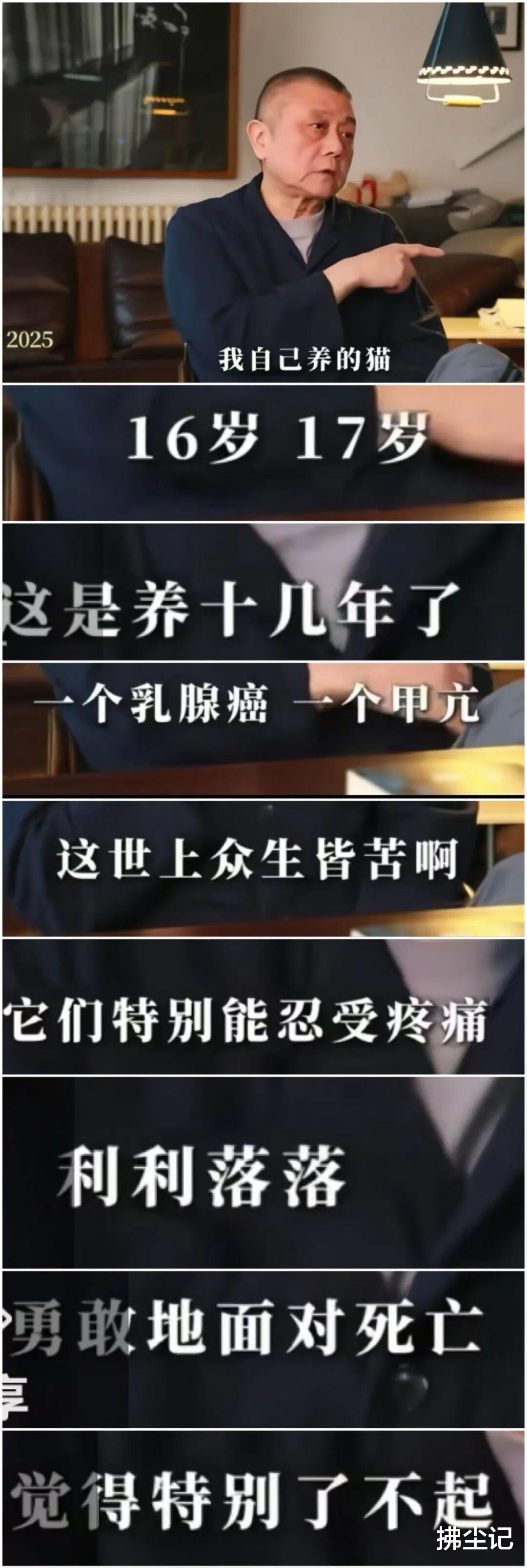 他养了2只猫,活了16、7年,算是高寿了,他看着它们的生命逝去,悟到:死亡这个话题,一点不沉重,要勇敢面对死亡、不要觍脸活在这世间,一生特别快就过了。