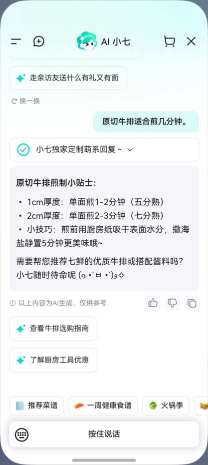 而且首页又是抽奖入口又是动态活动区,底部还多了个“AI小七”,我做的原切牛排就经过了它的指导,我就说在网上能学到真东西吧!