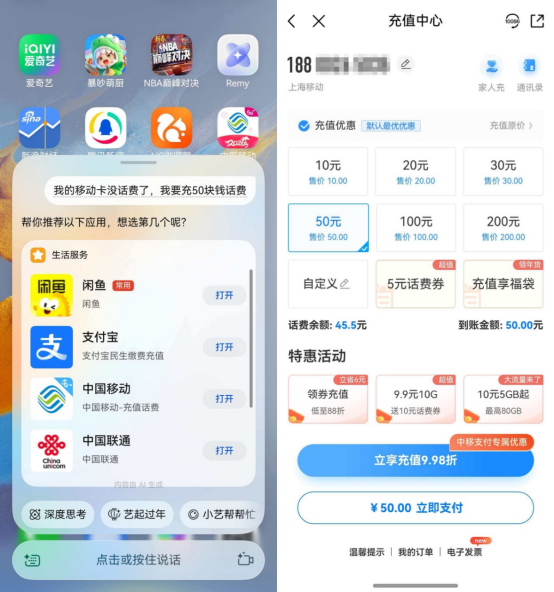 我平时用话费那最是浪费,充来充去的我自己都嫌弃麻烦,不过现在它接入了华为小艺,我直接一句“帮我用中国移动充话费”,小艺马上打开中国移动的支付页面,以后的话费就靠你了!