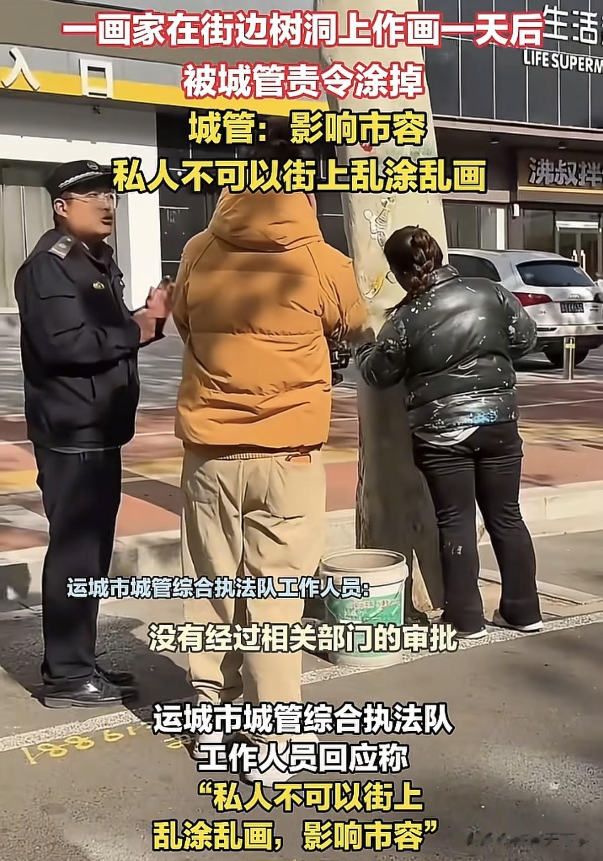 这两天,山西运城一女子在树洞绘画,被城管责令涂掉一事,引起不少争议!
