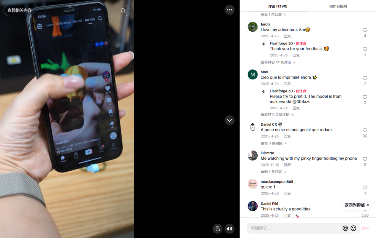 除了运营官方账号,Flashforge还通过与不同领域的TikTok达人合作,进一步扩大品牌声量,触达更多潜在消费者。