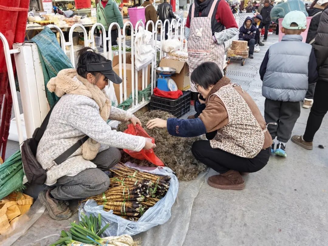 农贸市场更是生机勃勃,蔬菜水灵、肉类紧实,摊主们手脚麻利地称重、打包,价格在公示牌上一目了然。本地特产的糯山药成了年货市场里的“明星”。多个摊位将它摆在显眼处,吸引了不少市民驻足挑选。