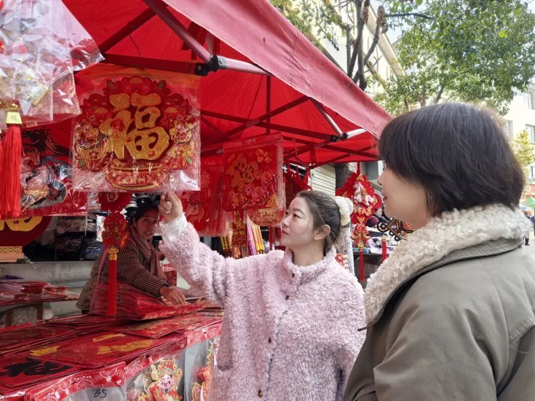 商超里,年货专区被装饰品点缀得格外亮眼。春联、福字挂满货架,粮油、肉蛋、水果、特色礼盒分区陈列,种类齐全,不少市民俯身细看,精心挑选。