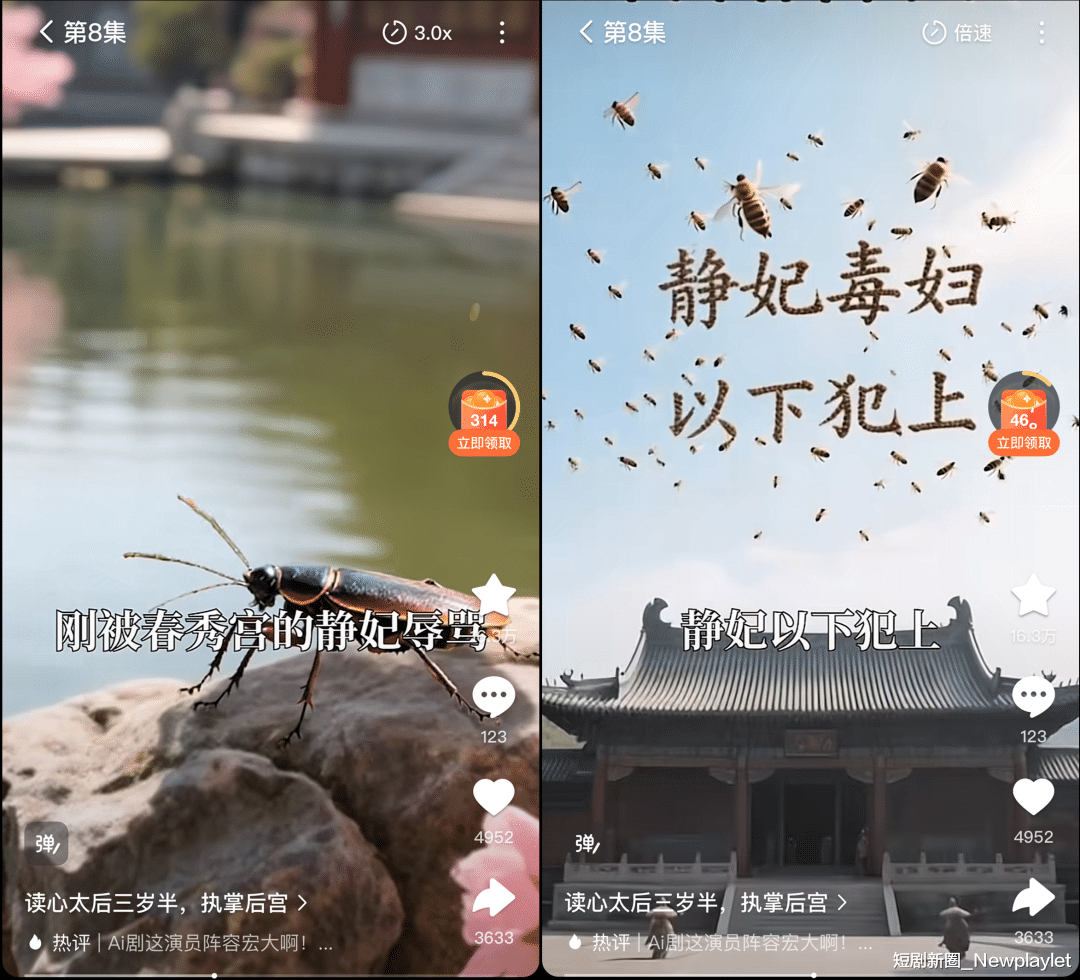 《奶团》中,出现的蟑螂说话、蜜蜂组字,这些能推动剧情发展的场景。虽然是雪宝的临时起意,但是放在传统影视里,可能需要比较久的特效周期和成本,而现在用AI就能轻松实现。所以对于创作者而言,AI不仅仅只是降本的手段,它也能助力创作者的内容表达。