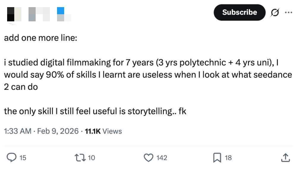 一位学习了7年数字电影制作的网友在体验后说,这个模型(Seedance2.0)是唯一一个让他感到害怕的模型,电影行业的所有岗位几乎都要消失了。90%他所学习到的技能,Seedance2.0都能实现。