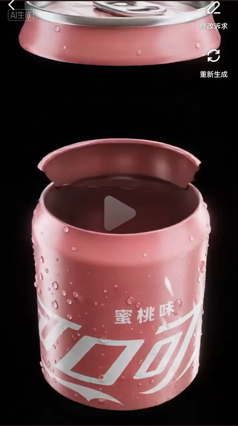 Seedance2.0所生成的广告片基本符合提示词要求,视频中的可乐罐与素材几乎丝毫不差。但仔细看,视频还是可以看出破绽,比如这一帧有一部分瓶身凭空出现。