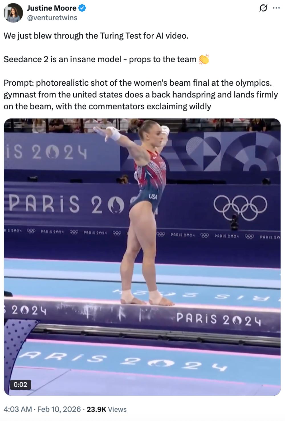 连国际知名投资机构a16z的合伙人Justine Moore用Seedance2.0制作出了一段奥运会女子平衡木决赛的镜头,并感叹说:“我们刚刚通过了AI视频模型的图灵测试。Seedance2.0简直不可思议。”