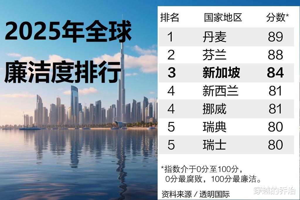 国际反贪组织“透明国际”(Transparency International)2月10日公布2025年度全球廉洁指数Corruption Perceptions Index。丹麦以89分连续八年居冠,紧接着是获得88分的芬兰,新加坡84分排名第三。新西兰和挪威以81分并列第四,瑞典和瑞士则以80分并列第五。