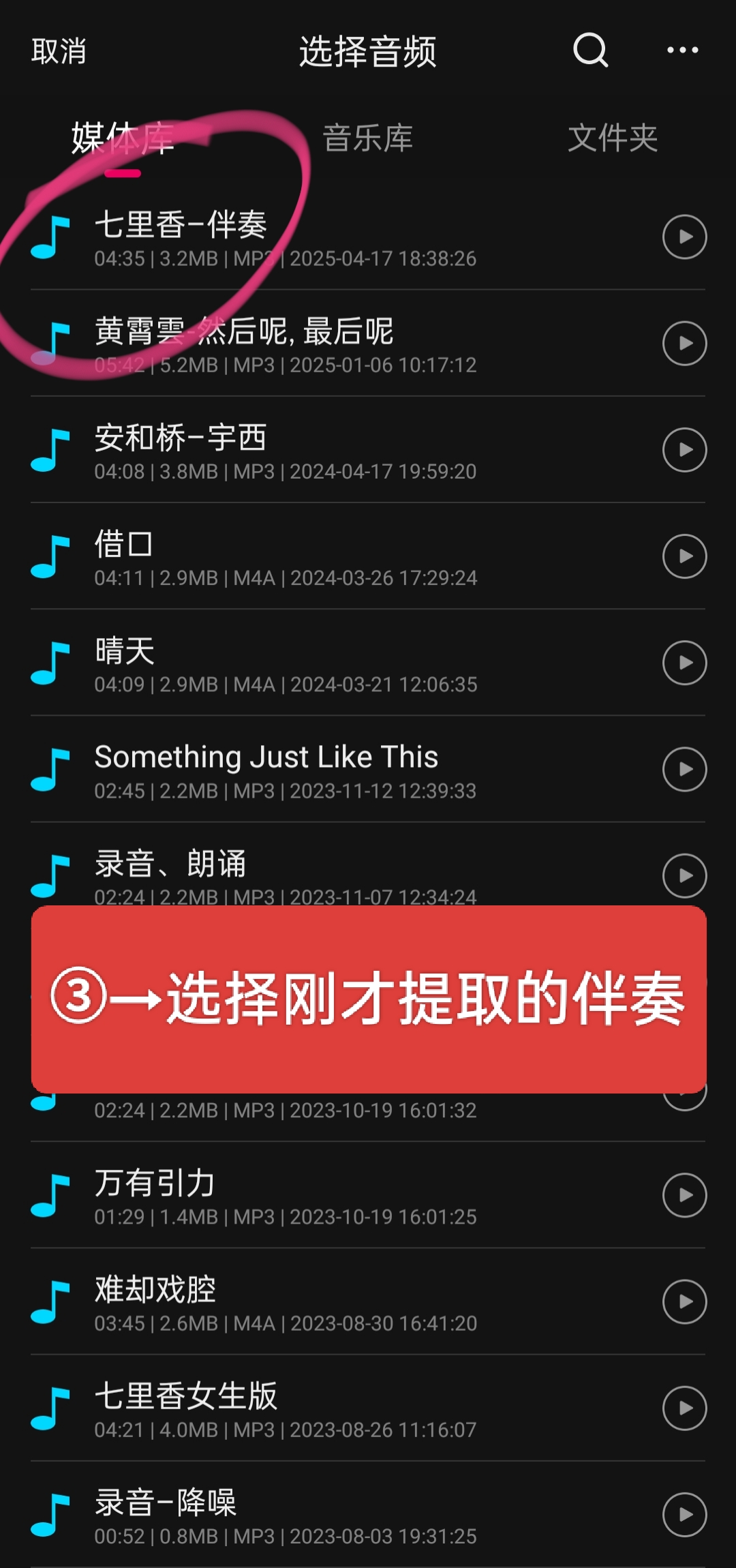 2.从手机里选择你想翻唱的歌曲(比如周杰伦的《七里香》),一键生成纯净伴奏!