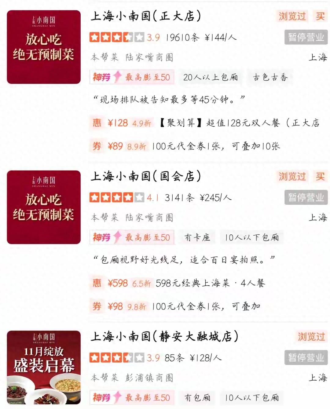 某前小南国区域经理 黄某某 透露,2025年下半年起,品牌就开始拖欠供应商货款,部分门店甚至靠临时工顶班维持运营。管理层的应对策略是:一边关店,一边收年夜饭订金。