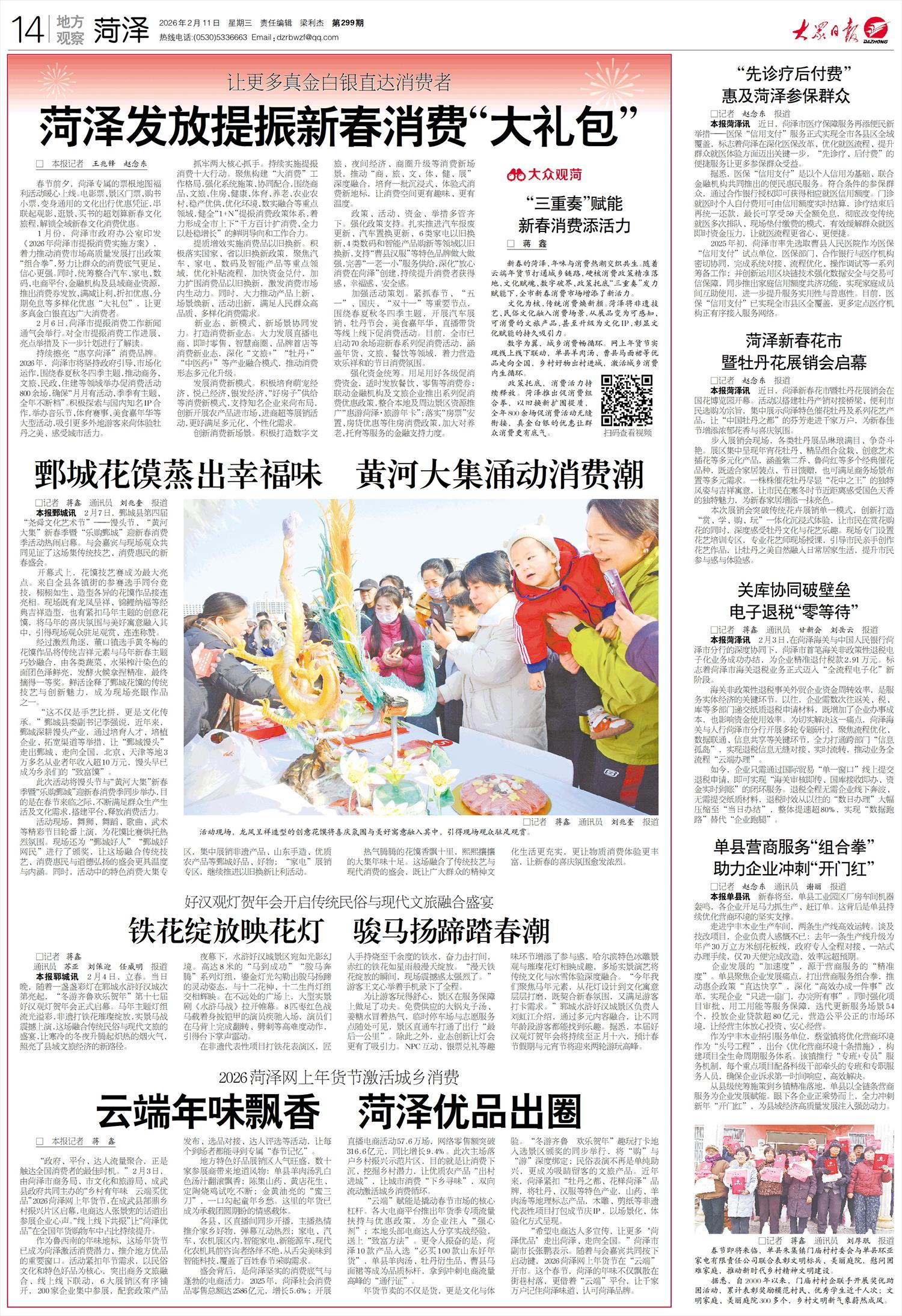 □ 本报记者 蒋 鑫 “政府、平台、达人流量聚合,正是触达全国消费者的最佳时机。”2月3日,由菏泽市商务局、市文化和旅游局、成武县政府共同主办的“乡村有年味 云端买优品”2026菏泽网上年货节,在成武县郜鼎乡村振兴片区启幕,电商达人张景宪的话道出参展企业心声。“线上线下共振”让“菏泽优品”在全国年货购物车中占比持续提升。 作为鲁西南的年味地标,这场年货节已成为菏泽激活消费潜力、推介地方优品的重要窗口。活动紧扣年节需求,以民俗文化和特色好品为核心,突出商务文旅融合、线上线下联动,6大展销区有序铺开,200家企业集中参展,配套政策产品发布、选品对接、达人评选等活动,让每个到场者都能寻到专属“春节记忆”。 地方特色好品展销区人气旺盛,数十家参展商带来地道风物:单县羊肉汤乳白色汤汁翻滚飘香;陈集山药、黄店花生、定陶烧鸡试吃不断;金黄油亮的“蜜三刀”,一口勾起童年乡愁。这里的年货已成为承载团圆期盼的情感载体。 各县、区直播间同步开播,主播热情推介家乡好物,弹幕互动热烈;家电、汽车、农机展区内,智能家电、新能源车、现代化农机具前咨询者络绎不绝,从舌尖美味到智能科技,覆盖了百姓春节采购需求。 盛会背后,是菏泽坚实的消费底气与蓬勃的电商活力。2025年,菏泽社会消费品零售总额达2586亿元,增长5.6%;开展直播电商活动57.6万场,网络零售额突破316.6亿元,同比增长9.4%。此次主场落户乡村振兴示范片区,目的就是让消费下沉、挖掘乡村潜力,让优质农产品“出村进城”,让城市消费“下乡寻味”,双向流动激活城乡消费循环。 “云端”赋能是撬动春节市场的核心杠杆。各大电商平台推出年货季专项流量扶持与优惠政策,为企业注入“强心剂”;本地头部电商达人分享实战经验,送上“致富方法”。更令人振奋的是,菏泽10款产品入选“必买100款山东好年货”,单县羊肉汤、牡丹衍生品、曹县马面裙等成为品质标杆,拿到冲刺电商流量高峰的“通行证”。 年货节卖的不仅是货,更是文化与体验。“冬游齐鲁 欢乐贺年”趣玩打卡地入选景区颁奖的同步举行,将“购”与“游”深度绑定;民俗表演不再是单纯助兴,更成为吸睛留客的文旅产品。近年来,菏泽紧扣“牡丹之都、花样菏泽”品牌,将牡丹、汉服等特色产业,山药、羊肉汤等地理标志产品,木雕、剪纸等非遗代表性项目打包成节庆IP,以场景化、体验化方式呈现。 “希望电商达人多宣传,让更多‘菏泽优品’走出菏泽、走向全国。”菏泽市副市长张鹏表示。随着与会嘉宾共同按下启动键,2026菏泽网上年货节在“云端”开市。这个春节,菏泽的年味不仅飘散在街巷村落,更借着“云端”平台,让千家万户记住菏泽味道、认可菏泽品牌。