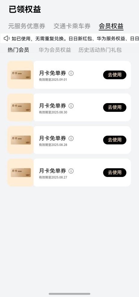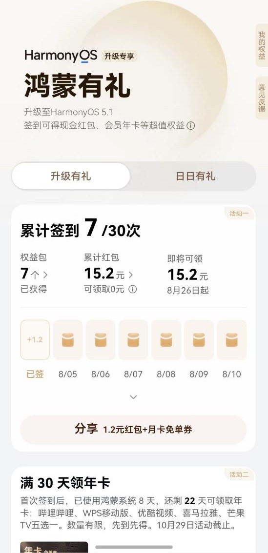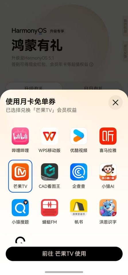 作为资深的鸿蒙粉,在收到鸿蒙5.1升级推送的当天就立刻升级了。在研究有什么新功能的时候发现了负一屏的“鸿蒙有礼”,点进去签了个到,虽然只有1块1的红包,但有月卡免单券!月卡免单券可以兑换B站、芒果TV、优酷、WPS、喜马拉雅等会员,我果断换了芒果TV会员!