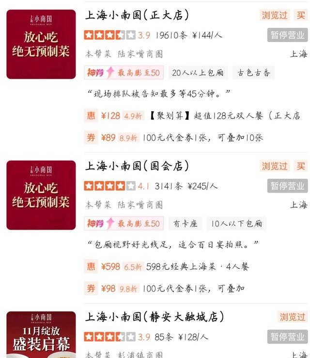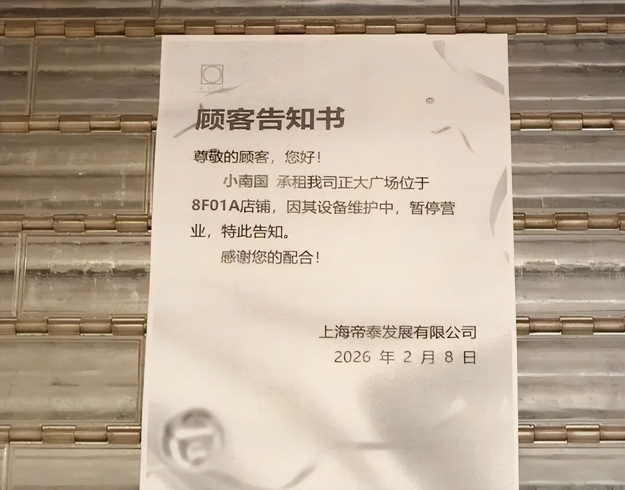 上海小南国这家老牌本帮菜餐厅,春节前突然把上海的十多家门店全关了。2月6日开始,正大广场店、金融街店这些地方就贴出暂停营业的告示,里面桌椅搬得干干净净。消费者本来还想着去吃年夜饭,结果订金付了,联系不上人。总部在静安区天目西路那栋楼,办公室门牌拆了,里面没人办公,东西打包好堆在那儿。物业说最近都没员工来过。