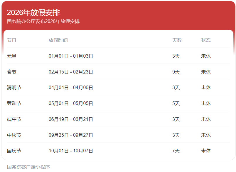 今天(4日),国务院办公厅发布关于2026年部分节假日安排的通知。