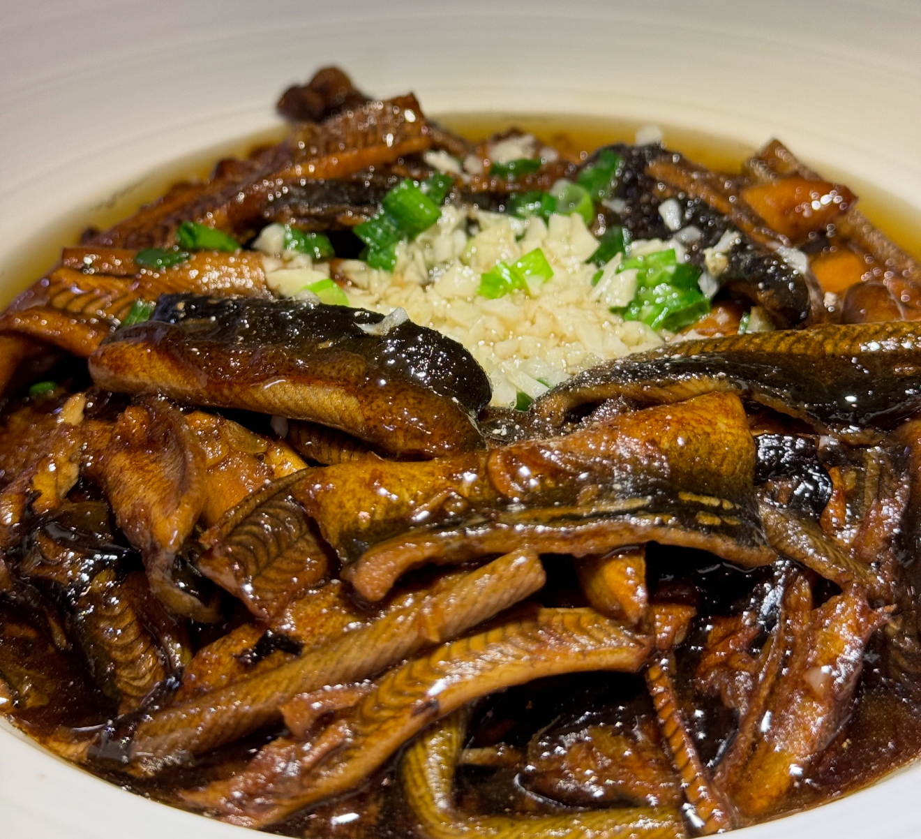 调好的酱汁沿锅边淋入,待汤汁沸腾时倒入淀粉水。重点来了!用锅铲背轻轻推拌,让每根鳝丝都裹上琥珀色的外衣。这时候可以撒入白胡椒粉,香气会瞬间被激活。