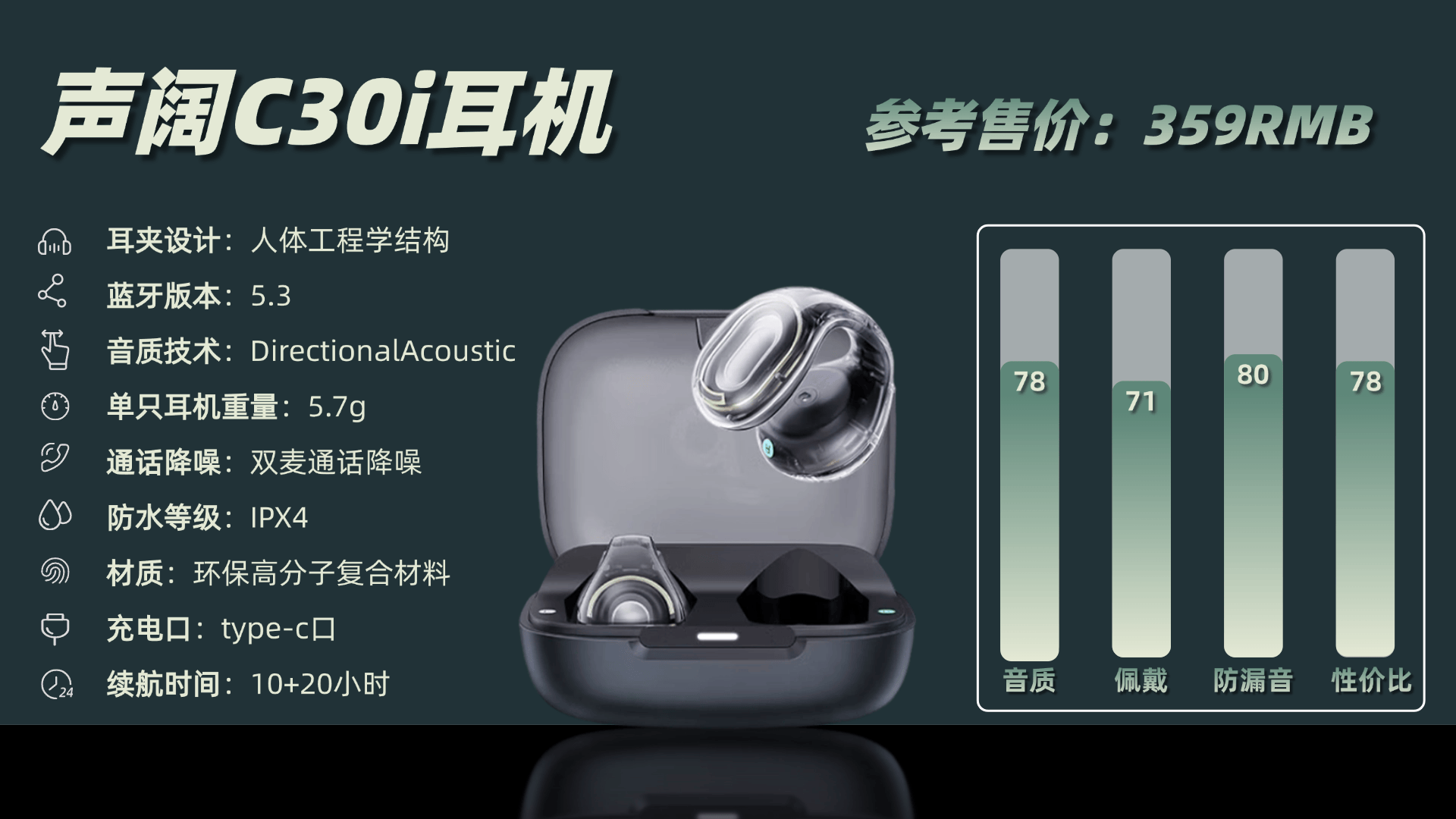 音质方面,耳机搭载17mm大动圈单元,低频厚实有力,鼓点表现出色,但高频解析略弱,整体三频均衡性稍欠。防水能力为IPX4,可抵御少量汗水和雨水。续航表现也不错,耳机单次可用约10小时,加上充电仓总续航可达20小时。C30i更适合追求个性外观且注重低频体验的用户。