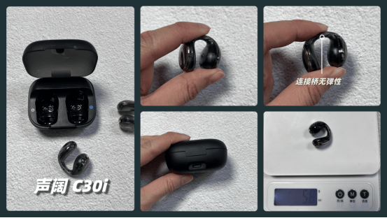 声阔C30i外观设计亮眼,半透明充电仓让内部结构一览无余,科技感十足,带有浓厚的赛博朋克风格。耳机采用C形夹设计,但连接桥为固定结构,对耳型要求较高,佩戴时夹耳感明显,舒适度一般。