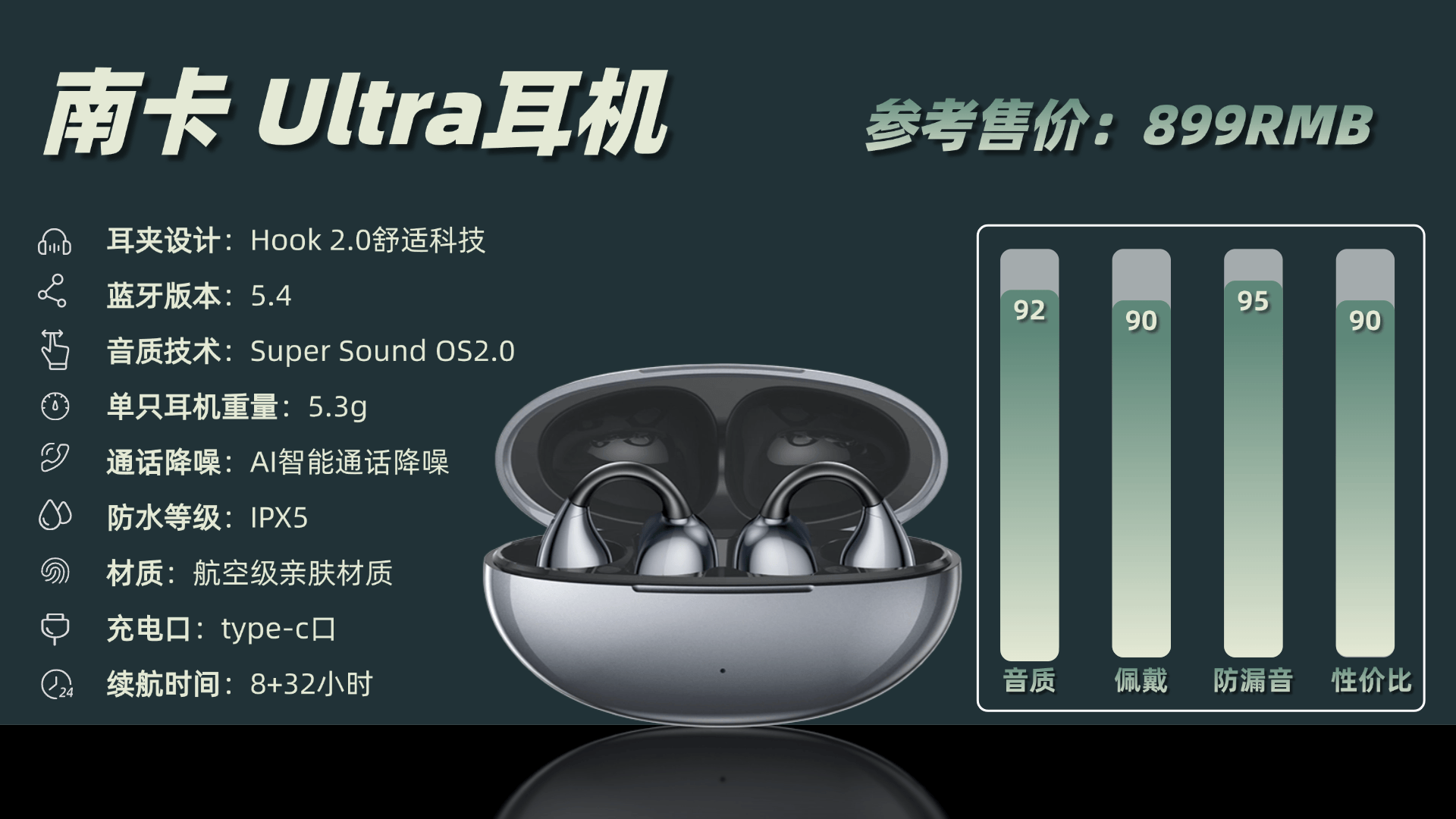 在如今很多开放式耳机过于追求颜值的情况下,南卡将重点放在佩戴舒适度上。通过对上万种耳道模型的深入研究和超过200次的优化试验,最终推出BUF2.0环扣设计,更贴合耳夹式佩戴,几乎消除了夹耳感和异物感,使得佩戴体验在开放式耳机中可称顶级。