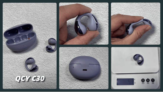 QCY C30采用水滴豆造型,紫罗兰配色辨识度高。耳夹部分在固定单元和发声单元上加入NCVM高光工艺,颜值不错,但连接桥较硬,长时间佩戴可能会有夹耳感。