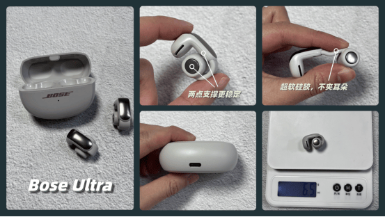 Bose Ultra延续了品牌简约的设计风格,提供黑白两色可选,外壳采用磨砂材质,触感顺滑且耐脏,不容易沾指纹。它的佩戴结构与常见的C形夹有所不同,发声单元额外延伸出一个支撑点,让耳机在长跑、跳绳等剧烈运动时依旧能保持牢固。不过,由于单只耳机重量相对较大,佩戴时会有一定的存在感。