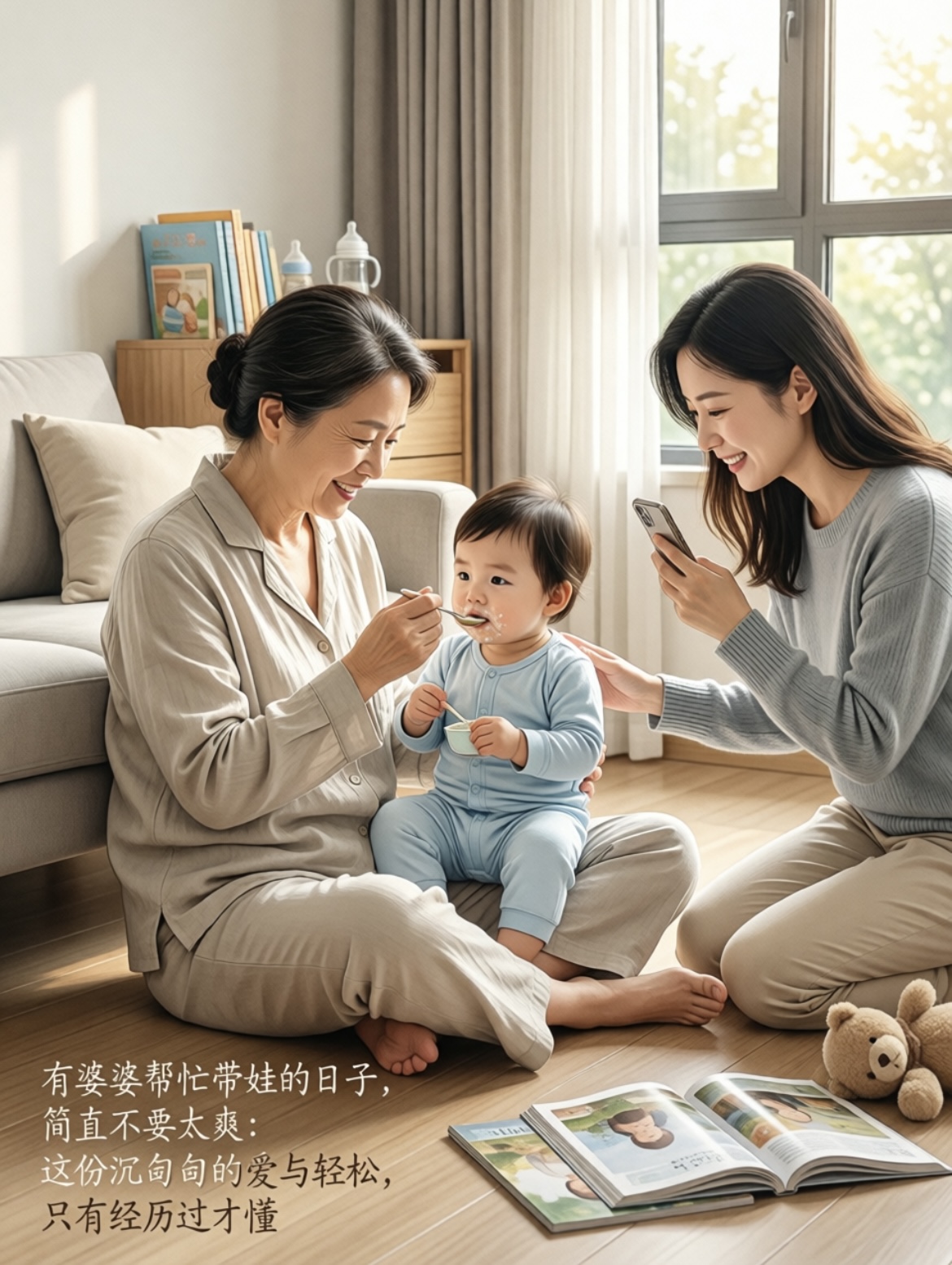 婆婆的到来,就像是给这个小小的家注入了一股温柔而坚定的力量。她总是能在我还没开口前,就熟练地把宝宝哄睡,动作轻柔得仿佛在对待一件稀世珍宝。看着她布满岁月痕迹却无比灵巧的双手,耐心地给宝宝换衣服、喂水,那份从容与淡定,让我悬着的心彻底放了下来。我不再需要时刻神经紧绷,担心宝宝的每一次哭闹,也不必为了琐碎的家务焦头烂额。我可以安心地补个回笼觉,或者静静地坐在一旁,享受片刻的宁静,看着这温馨的一幕,心中满是感激。