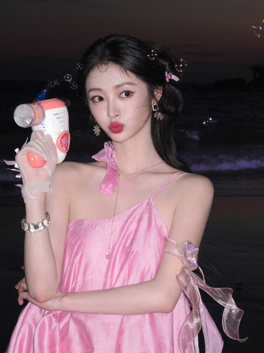 夜色中的大海波光粼粼,粉色身影踩着细沙,手举泡泡机,浪花轻抚的海岸线上自在甜笑——这组照片点燃了全网的夏日幻想。