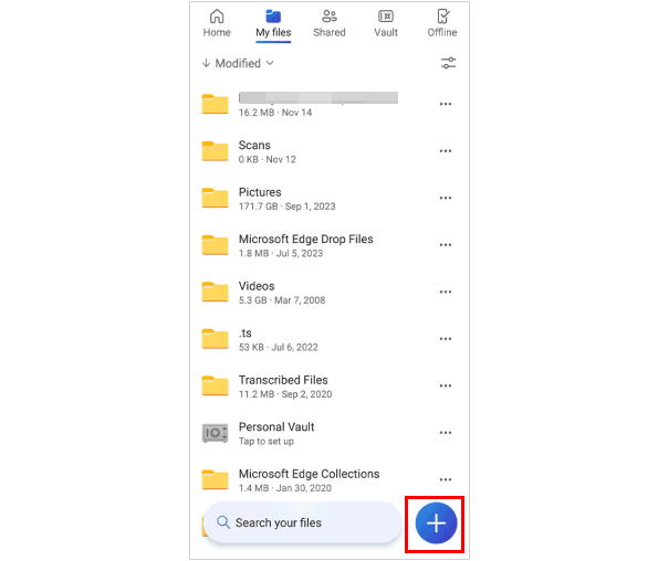 2. 在华为手机上,单击+将您的华为文件上传到您的 OneDrive 帐户。
