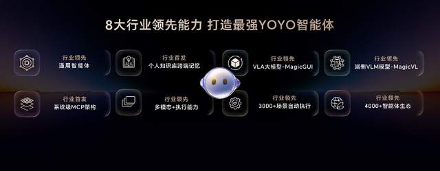 除了荣耀自研的UI Agent能力,YOYO更搭载行业首发的系统级MCP架构,深度打通系统底层超过80%的高频场景,接入超过4000个生态MCP和生态智能体,实现3000个场景的自动执行,堪称行业最强通用智能体。