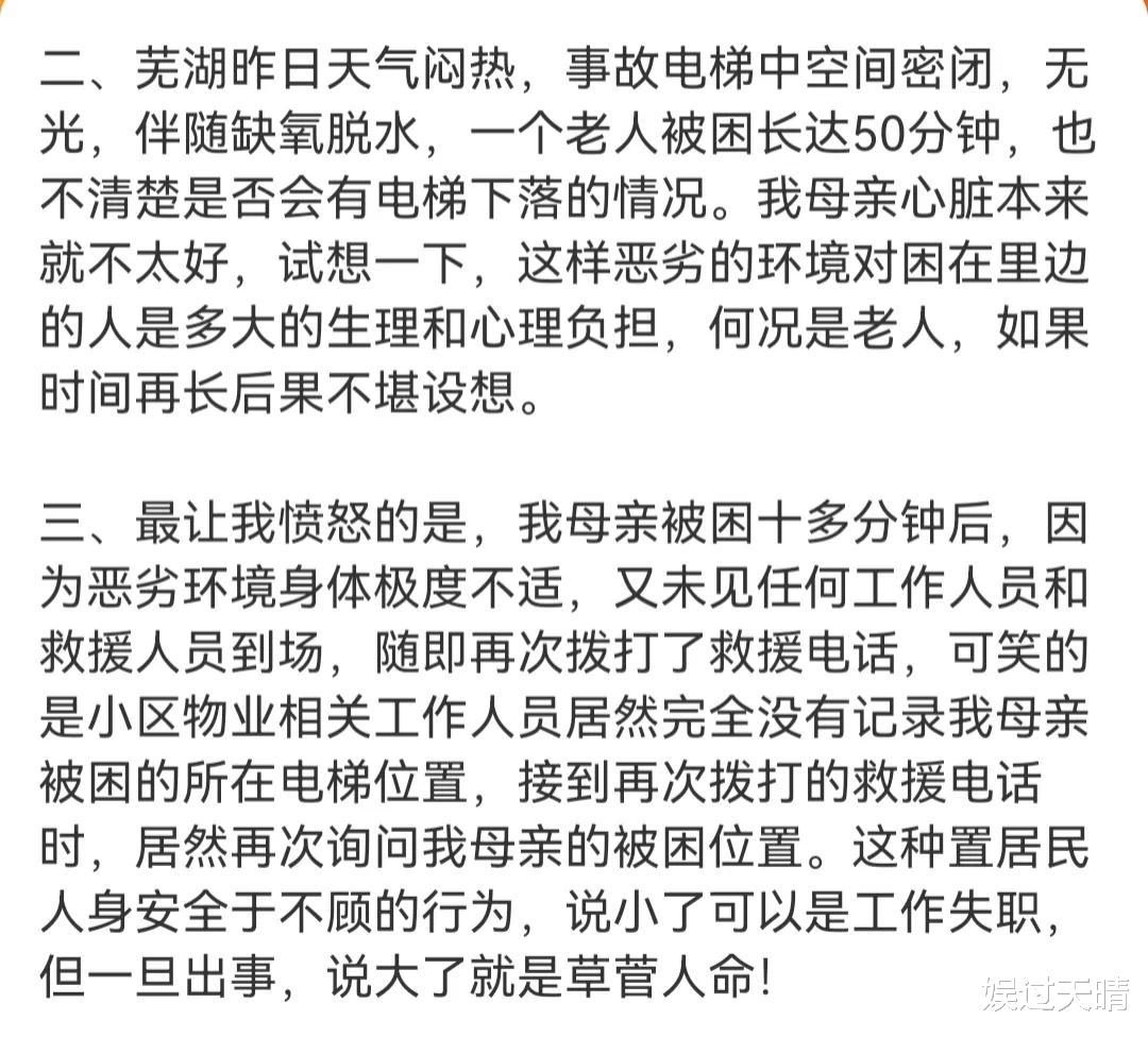 李纯母亲被困在电梯50分钟,当地天气炎热,因为停电电梯里又没有空调,宛如一个蒸笼,而且人对于危险和未知都会感到害怕,一个60多岁的老人被关在电梯里50分钟,真的想想就害怕。