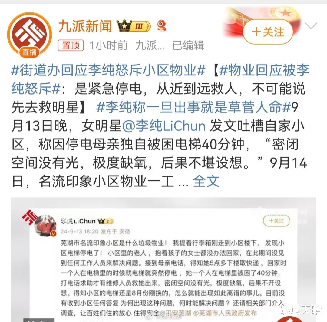 9月14日,一向好脾气的李纯突然发长文怒斥某小区物业失职,导致自己母亲被困在小区电梯里长达50分钟,差点心脏病发。