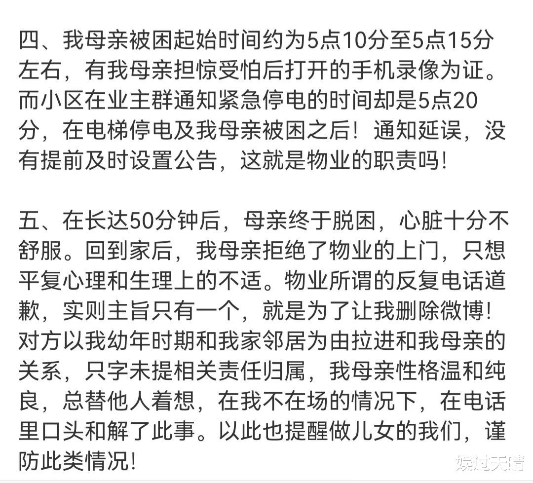 事情的起因是昨天李纯母亲所居住的小区突然停电,物业没有提前通知,停电后也没有立刻通知,李纯母亲在乘坐电梯时,刚好就遇到了停电,电梯无法打开,李纯母亲就被困在电梯里了。