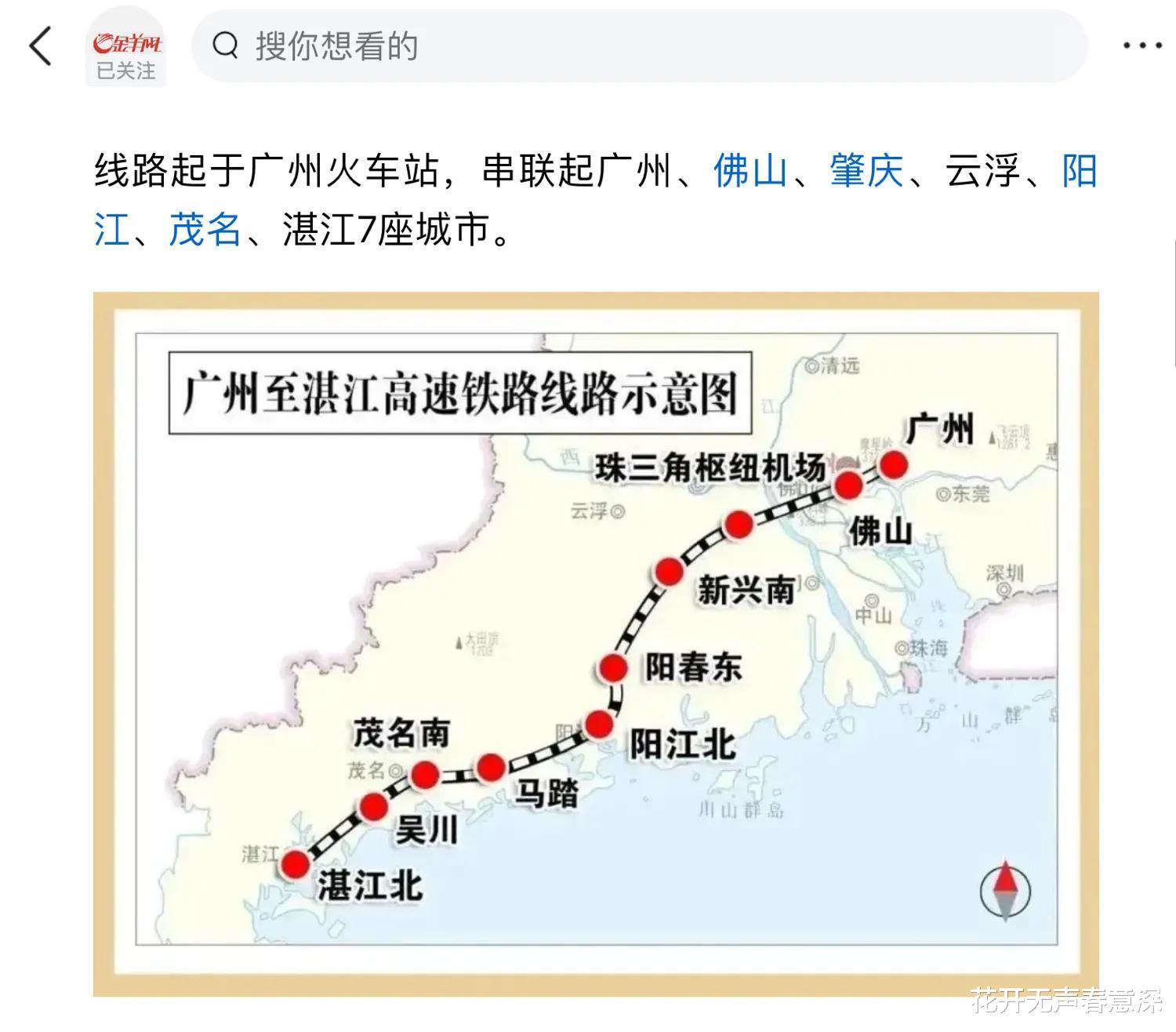 据报道,广州到湛江的高铁将会在2025年底完工,估计开通也是很快的事情,届时,从广州出发坐高铁到终点湛江将会实现一个半小时生活圈,早上在广州吃完早茶,再坐90分钟的高铁到湛江吃个海鲜,实现生蚝自由,真的是一件愉快的事情啊。新的广湛高铁,总共串联7个城市,从广州出发-佛山-肇庆-云浮-阳江-茂名-湛江为终点,可以说完全打通了粤西方向。在广东一直有一个说法,叫做“路通财通”,毫无疑问,这条高铁的开通,一定会让珠三角和粤西连接变得更加的方便和有效率,最重要的是解决了从珠三角返回粤西原来需要花比较长时间的问题。