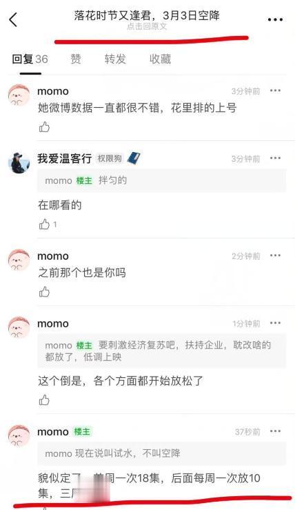《落花时节又逢君》这部戏也似乎一直在试水,频繁传出要播出的消息,但一次次又没有了下文,近日,该剧又有消息了,据说会在3月3号空降播出,爆料者还称首周一次18集,后面每周一次放10集,三周播完。