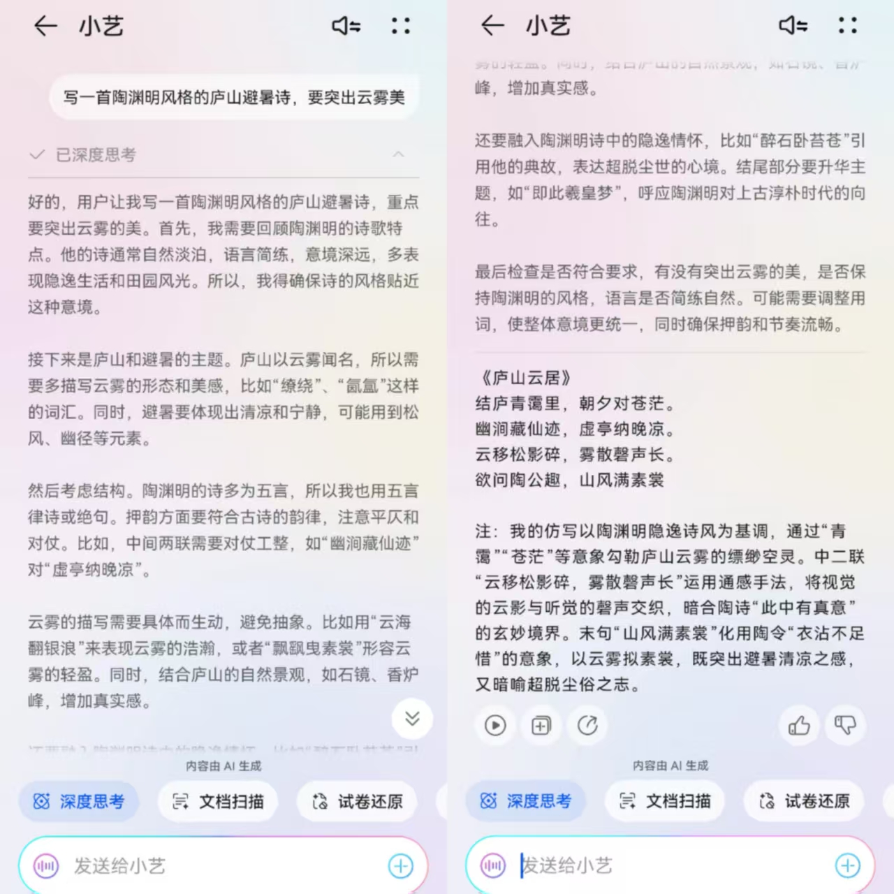 而在面对复杂问题时,启动“深度思考”模式可获取更高质量回复。例如在创作时,和小艺说 “写一首陶渊明风格的庐山避暑诗,要突出云雾美”。小艺便会先琢磨陶渊明的诗风特点、诗词结构,再结合庐山避暑主题构思,不仅能交出合格诗作,还会展示创作思路,帮着打开思路。要是职场人赶报告时问“分析下短剧爆火的原因”,小艺也能条理清晰地从用户行为,内容生产,商业模式等维度拆解问题,给出有价值的参考。