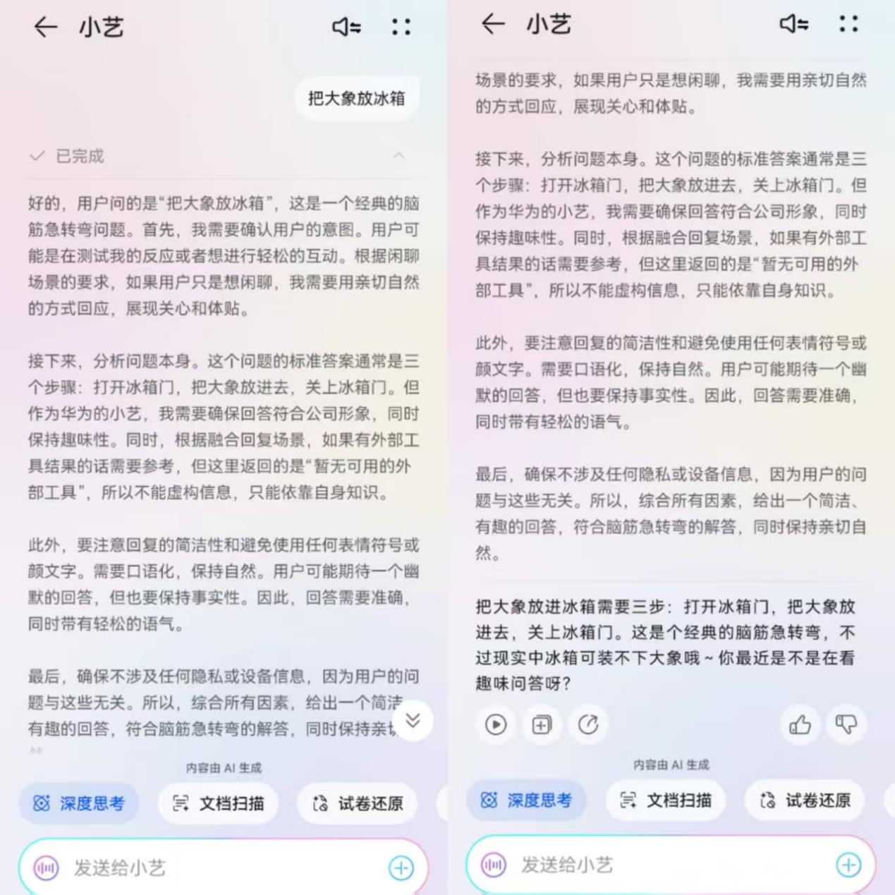 过去和AI对话,常感觉像在“对暗号”;但升级后的小艺,聊天活人感明显强多了,甚至能get到你的“言外之意”。比如问TA“把大象放冰箱要几步”,多数AI只会机械地说“三步”。小艺却会先判断你是要幽默答案还是真有疑问,给出的答案既符合规则又不失幽默感,这种带点调侃又不失严谨的回答,简直和跟朋友唠嗑没差。