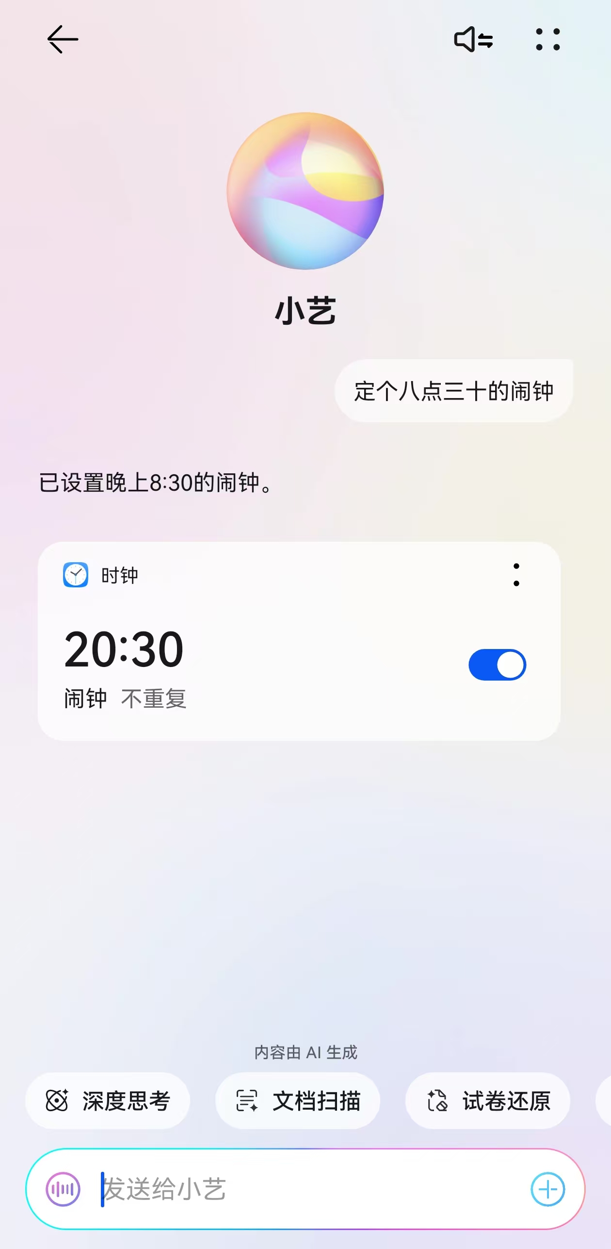 日常场景中,小艺的“快思考”模式反应迅捷。比如,晚上赶报告时喊一句“小艺,定个八点半的闹钟”,话音刚落提醒就设好了;想查天气,直接说“小艺小艺,今天的天气报一下”,几乎话音刚落,小艺就已开始播报,想知道什么问问小艺就行。