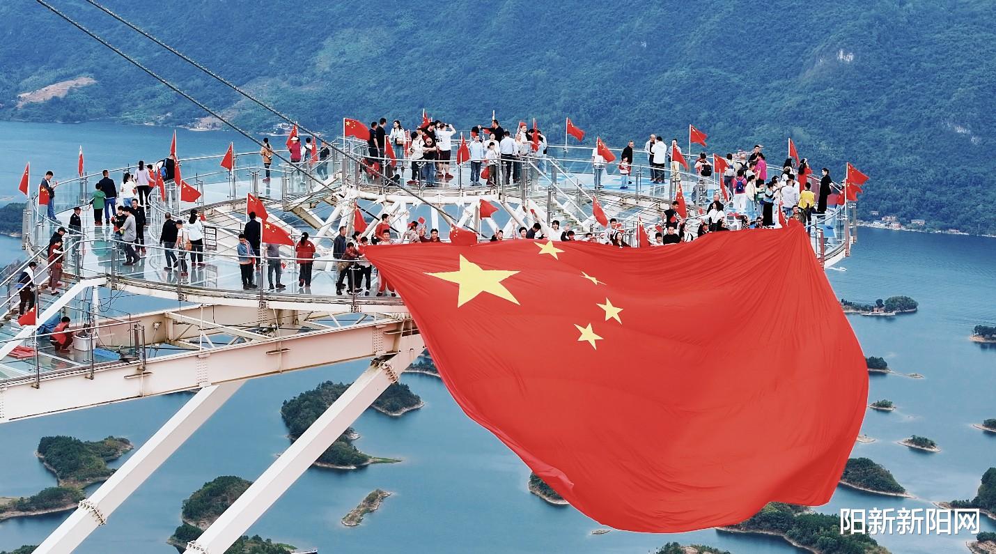 为庆祝国庆、中秋,阳新县各景区精心策划系列主题活动。在王英镇天空之城景区,一系列互动活动引爆全场。“与国旗同框”打卡活动颇受欢迎,游客们手持分发的小国旗,在巨型国旗下留下珍贵影像,并在一旁的“祝福祖国”签名墙上,写满了对祖国的深情寄语。现场还有爱国快闪演出,激昂的国风大鼓表演与《歌唱祖国》等经典歌曲交织,震撼全场。