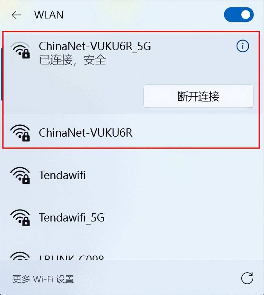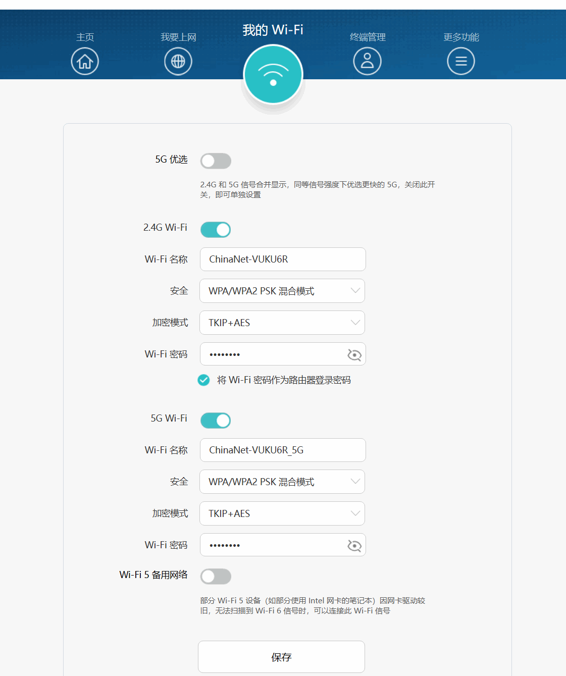 可以开启5G优选,2.4G 和 5G 信号合并显示,同等信号强度下优选更快的 5G,关闭此开关,即可单独设置。