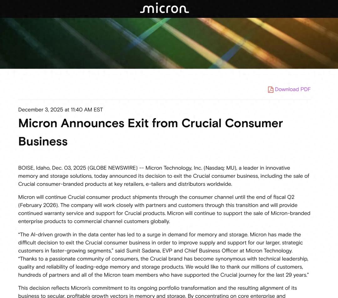 最近,更加雪上加霜的消息来了:当地时间 12 月 3 日,镁光科技公司宣布,决定退出消费级市场,终止 Crucial(英睿达)消费级业务,包括在全球主要零售商、电商平台和分销商处销售英睿达消费品牌产品。