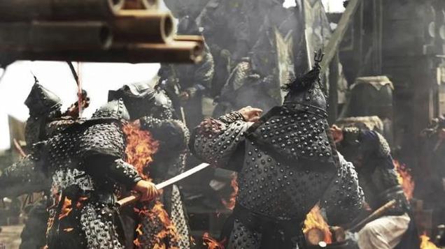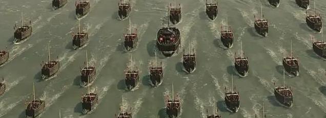 2014年的《鸣梁海战》使用了大量特效,这让电影的战争场景十分壮观,尤其是当李舜臣率领的12艘战船一字摆开时,镜头从来岛通总的头顶缓缓升起,俯视日方军阵: