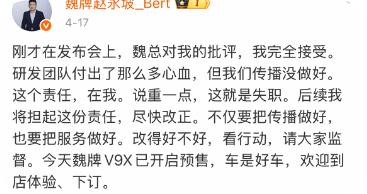 面对董事长的直接批评,魏牌CEO赵永坡当场登台致歉,承认品牌在传播、服务等方面与国际豪华品牌存在较大差距,并承诺改进。随后他在个人微博上进一步回应:“研发团队付出了那么多心血,但我们传播没做好。这个责任,在我。说重一点,这就是失职。”他表示将担起责任,尽快改正,“改得好不好,看行动,请大家监督”。