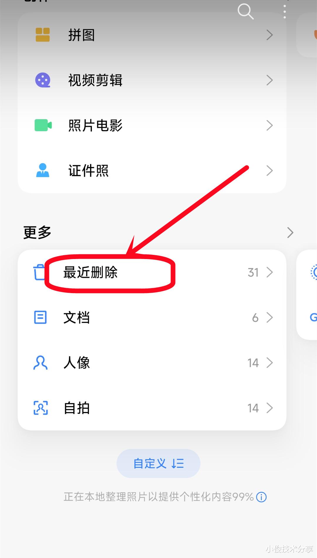 因此一旦我们发现照片不小心丢失之后,咱们要做的第一件事,就是打开相册,可是打开相册之后,很多朋友可能会发现,这里并没有删除的照片啊,此时,我们需要往下滑动,因为这些删除的照片,是保留在一个最近删除的文件夹里面!