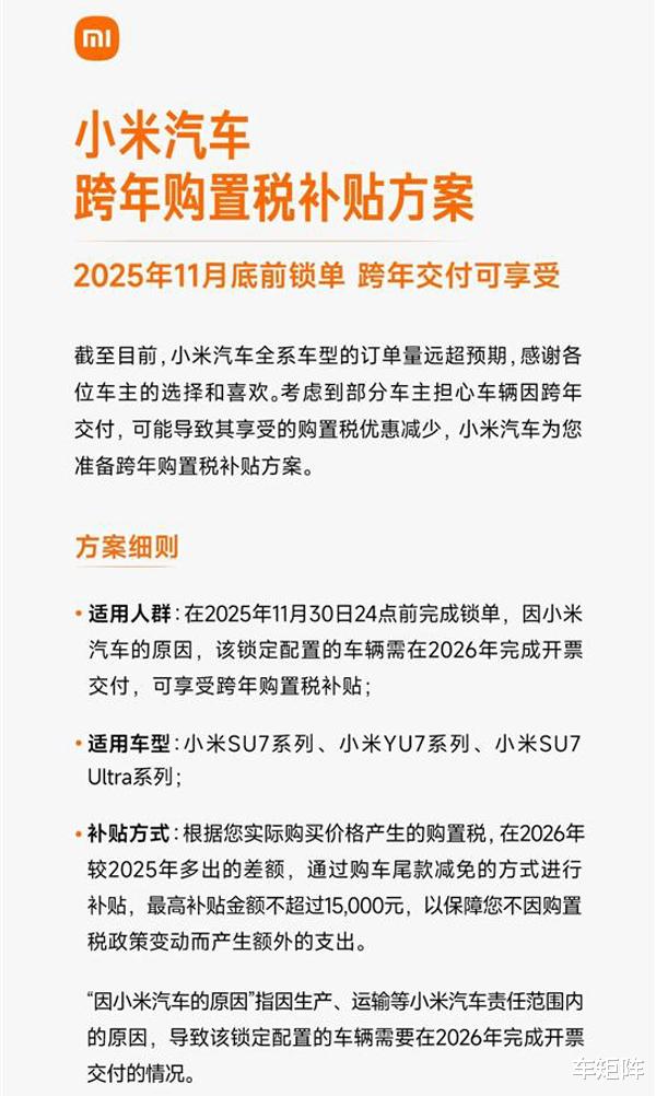 小米一方面力保现有订单车主交车周期,如车辆因产能原因跨年交付有可能导致该部分车主享受的购置税减免优惠减少,另一方面也是吸引尚未下定的准车主不再犹豫,因此这个跨年购置税补贴方案可以说是小米汽车给车主在购置税减免问题上吃了一个定心丸!