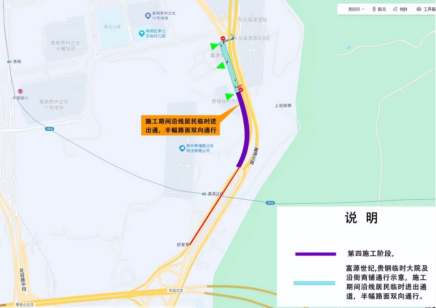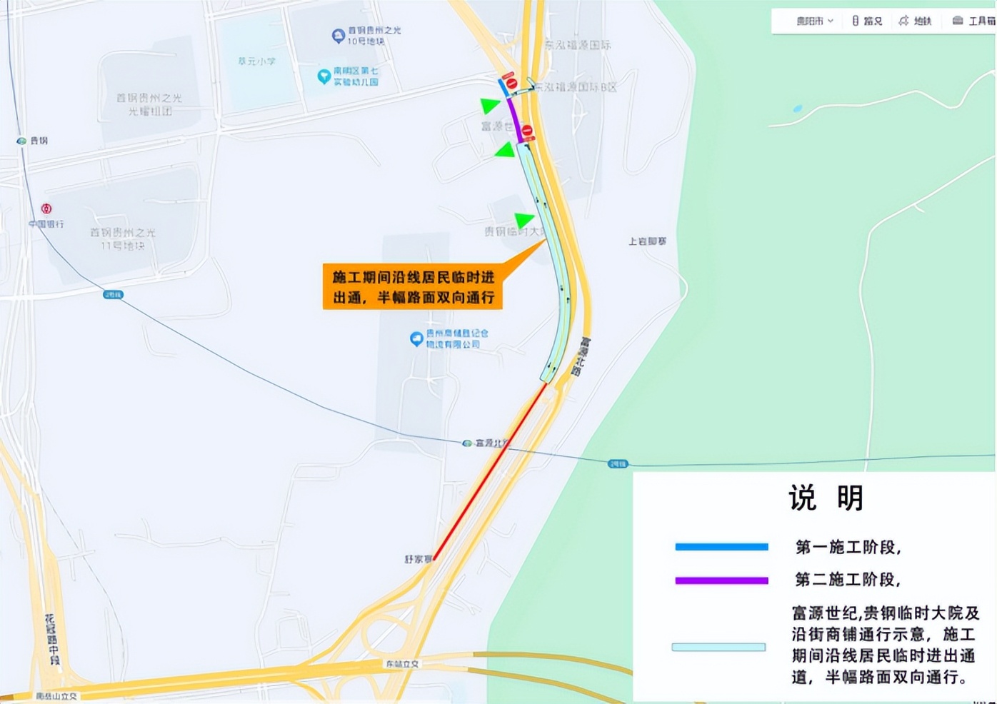 封闭施工期间采取分段围挡和半幅路面双向通行的方式保障富源世纪、贵州省药材公司、富源小区贵钢临时大院等沿线小区居民的车辆通行。