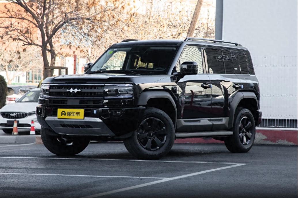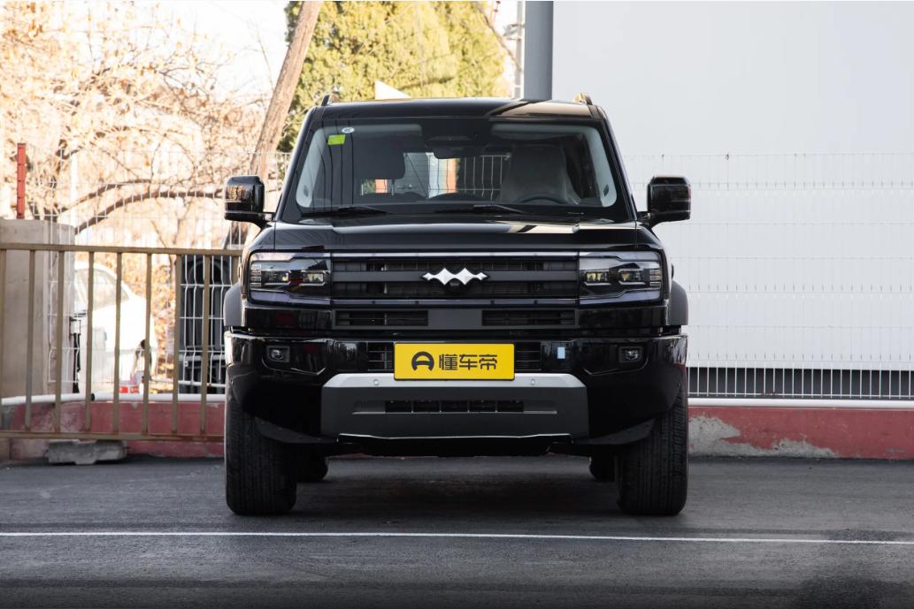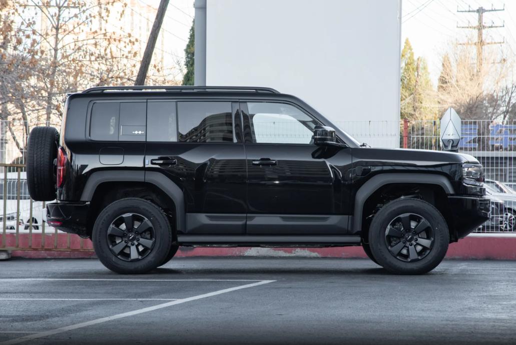 车侧越看越耐看,细节很到位。门把手用的是传统机械样式,耐用又顺手,车身下沿一圈黑色护板特别粗壮,硬核越野味儿直接拉满。车顶行李架、固定踏板都是全系标配,想更方便也能选装电动踏板,日常上下车更舒服。