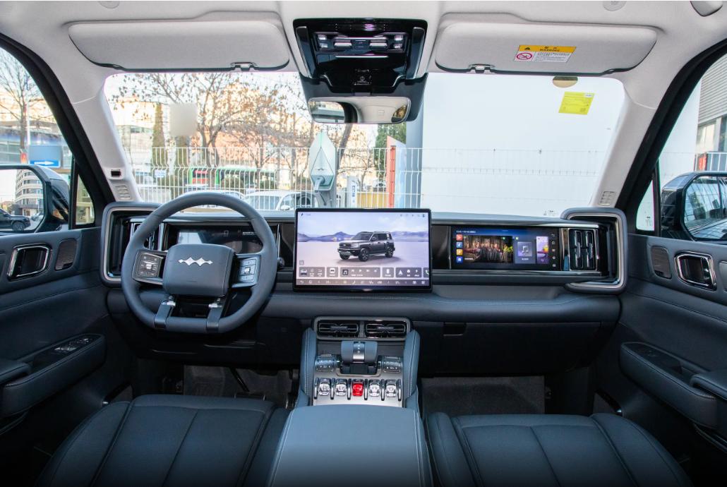 内饰整体造型平行稳重,采用了较多硬朗的线条刻画,以及方型元素点缀,加上车门两边采用了锁环式扶手及锁环式门扣的设计,流露出硬派气息。15.6英寸中控屏+12.3英寸副驾驶娱乐屏+12.3英寸液晶仪表,再加上26寸抬头显示,五联屏布局科技感十足,操作起来也很顺手,日常用着很方便。