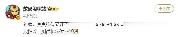 除此之外,博主@数码闲聊站 最近发文爆料称,真我又开了一块三星屏,6.78"±1.5K LTPS 大 R 角直屏,有超声波指纹,测试机定位不低。