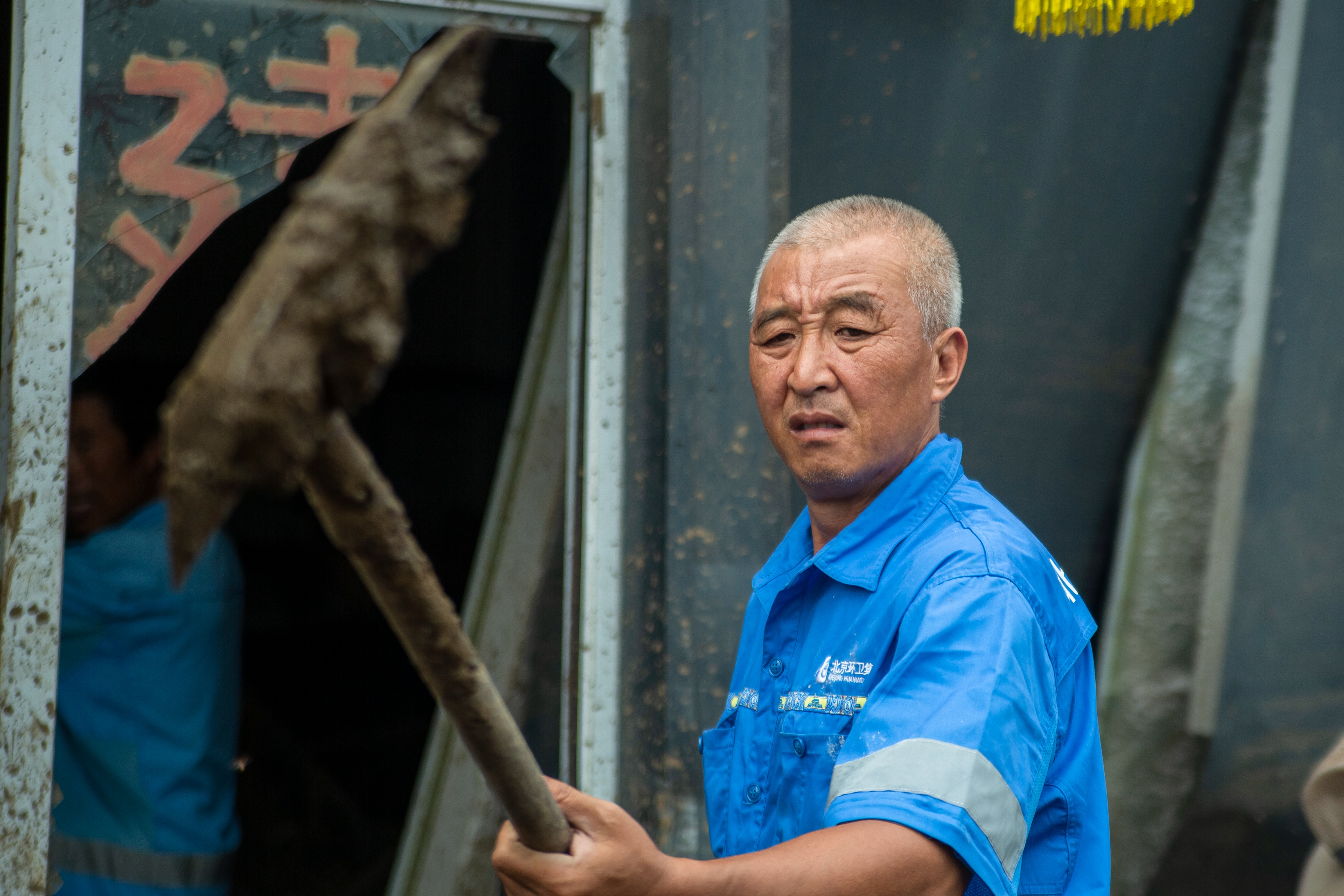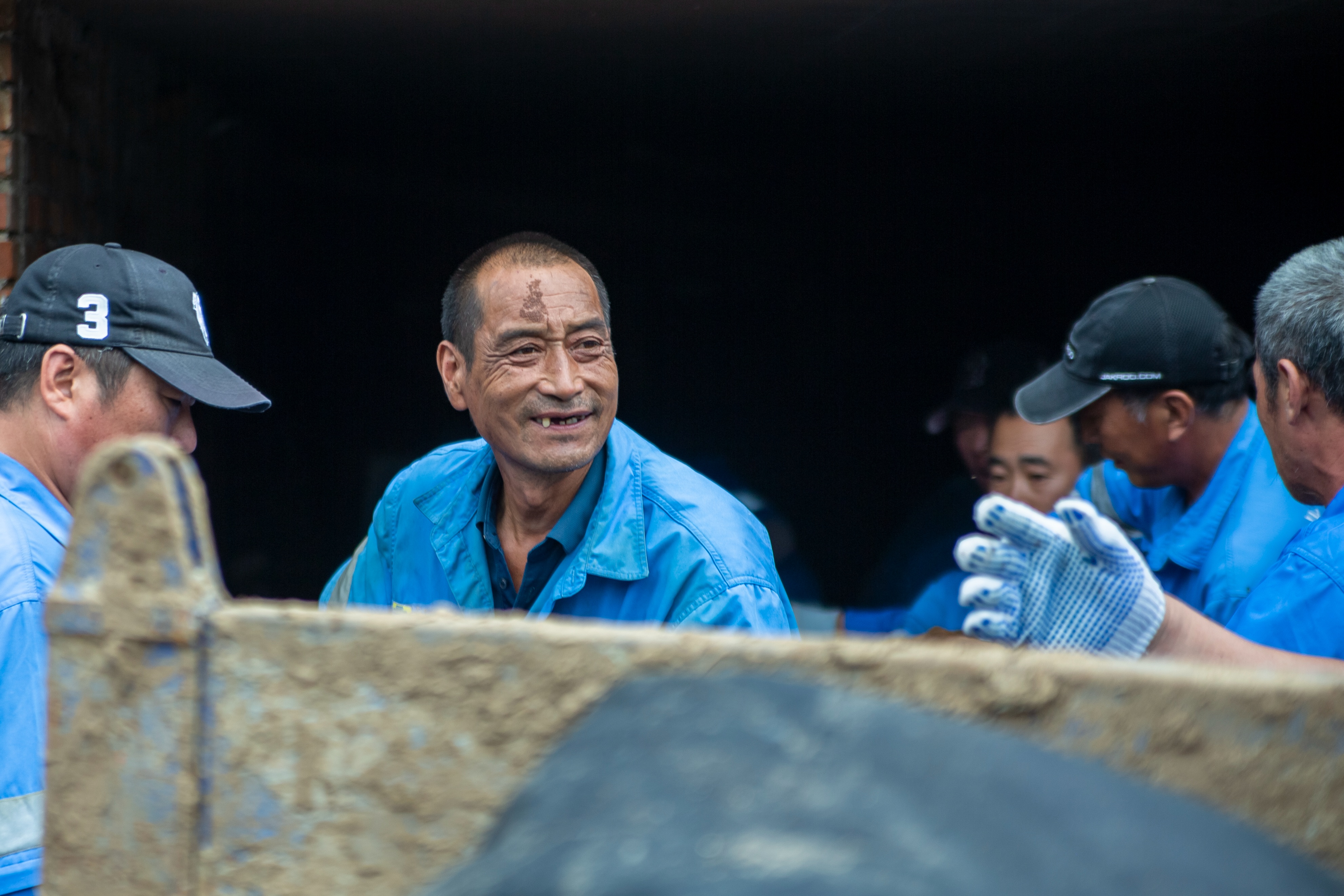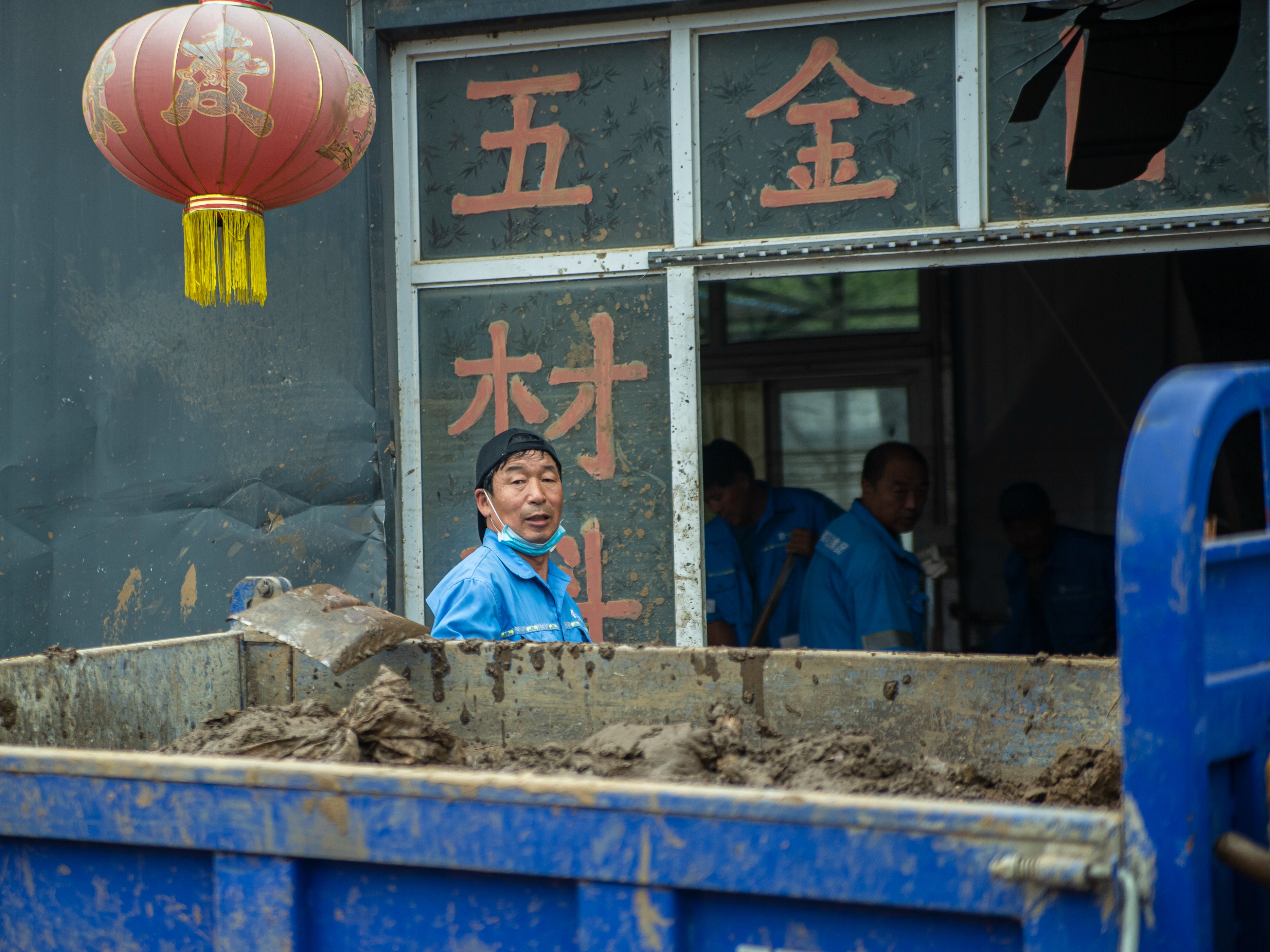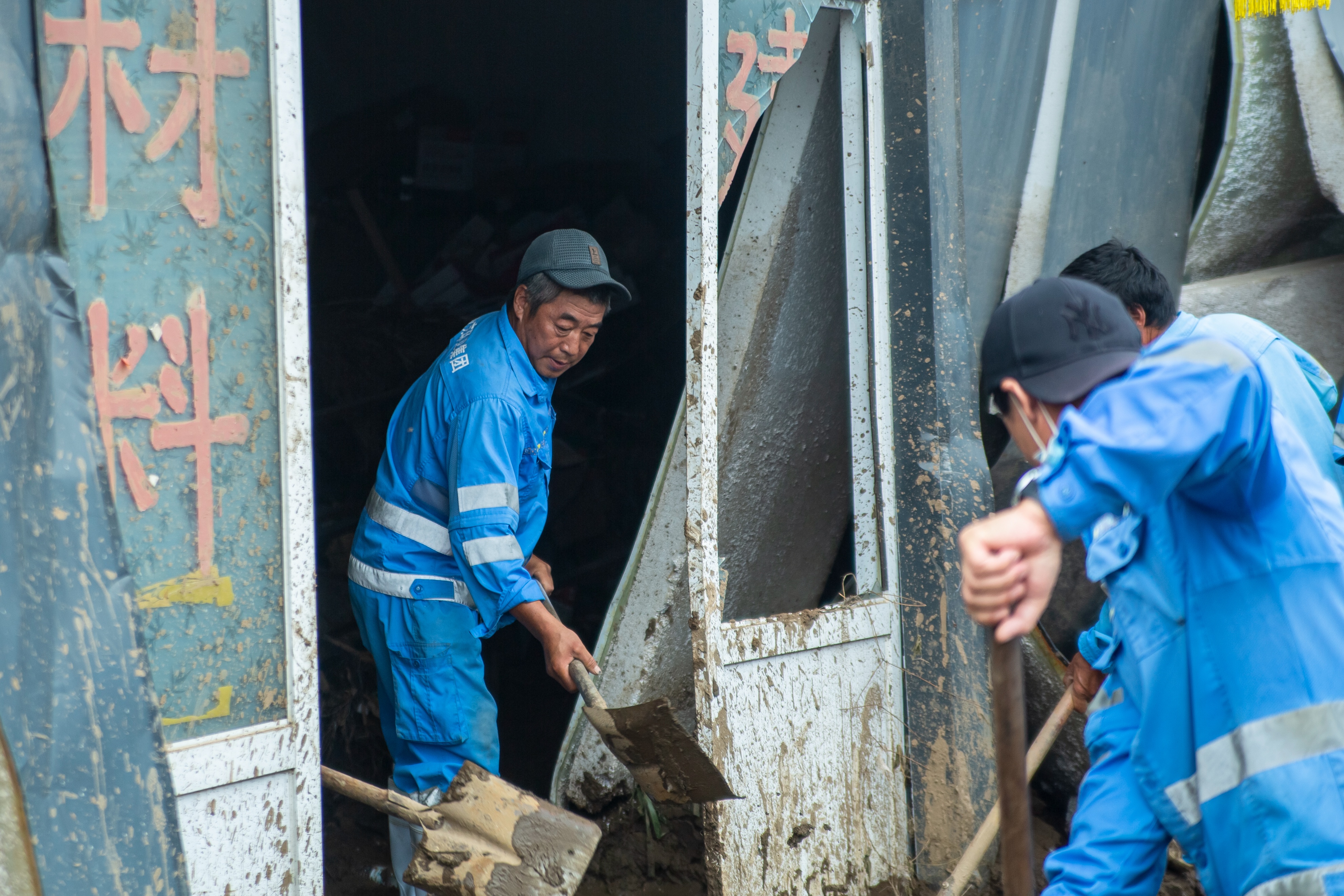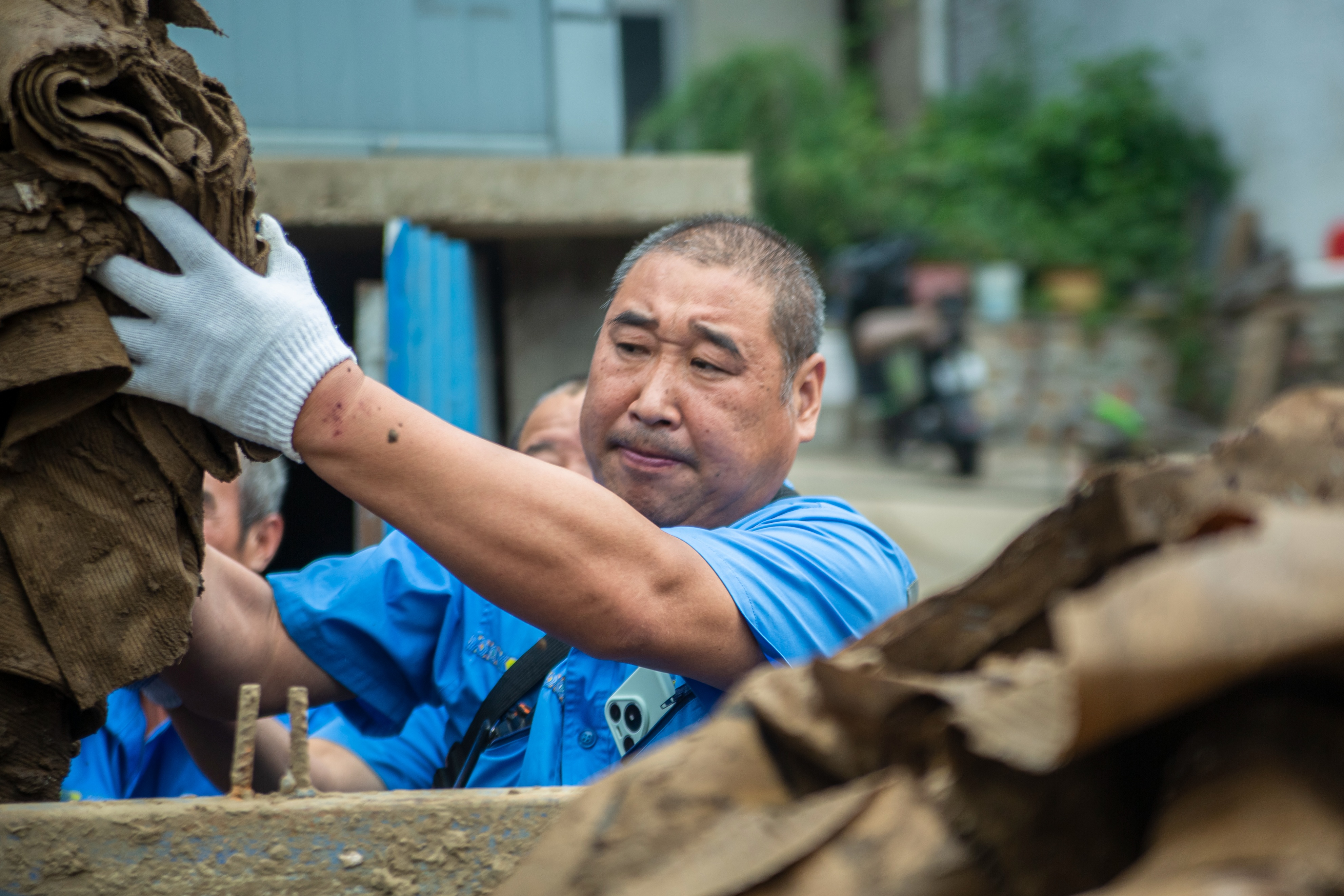 一位年轻队员手套磨破,掌心渗出血迹仍紧握铁锹;年长的师傅则蹲在路边,用石块敲打工具上凝固的泥浆,嘴里念叨着“抓紧清完,让老乡早回家”。清运车往来穿梭,引擎声、号子声交织成重建的序曲,蓝色工装在泥污中更显鲜亮,成为镇罗营复苏路上最动人的风景。