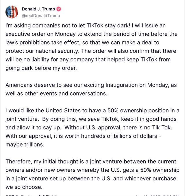 特朗普周日在其社交平台 Truth Media发文称,“我请求各公司不要让 TikTok 关灯!我将于周一签署一项行政命令,延长该法律禁令生效的期限,以便我们能够达成协议来保护我们的国家安全。”他续称:“该命令还将确认,任何在我下令之前,帮助阻止 TikTok 关闭的公司均不承担任何责任。”